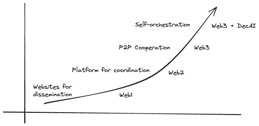 The diagram below illustrates the trajectory of the internet's history from Web1 to Web3 (+decentralised AI) and the effect this has on the collective intelligence and its ability to connect to others within the network. Web3 will not be explained in these documents but the principles that underpin it are essential to understanding DeSci.